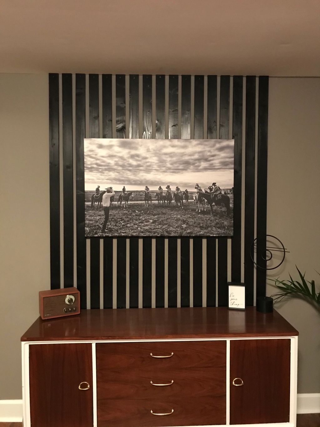 Wood slat accent wall done for a customer. Looks great with his “cowboys prayer” print